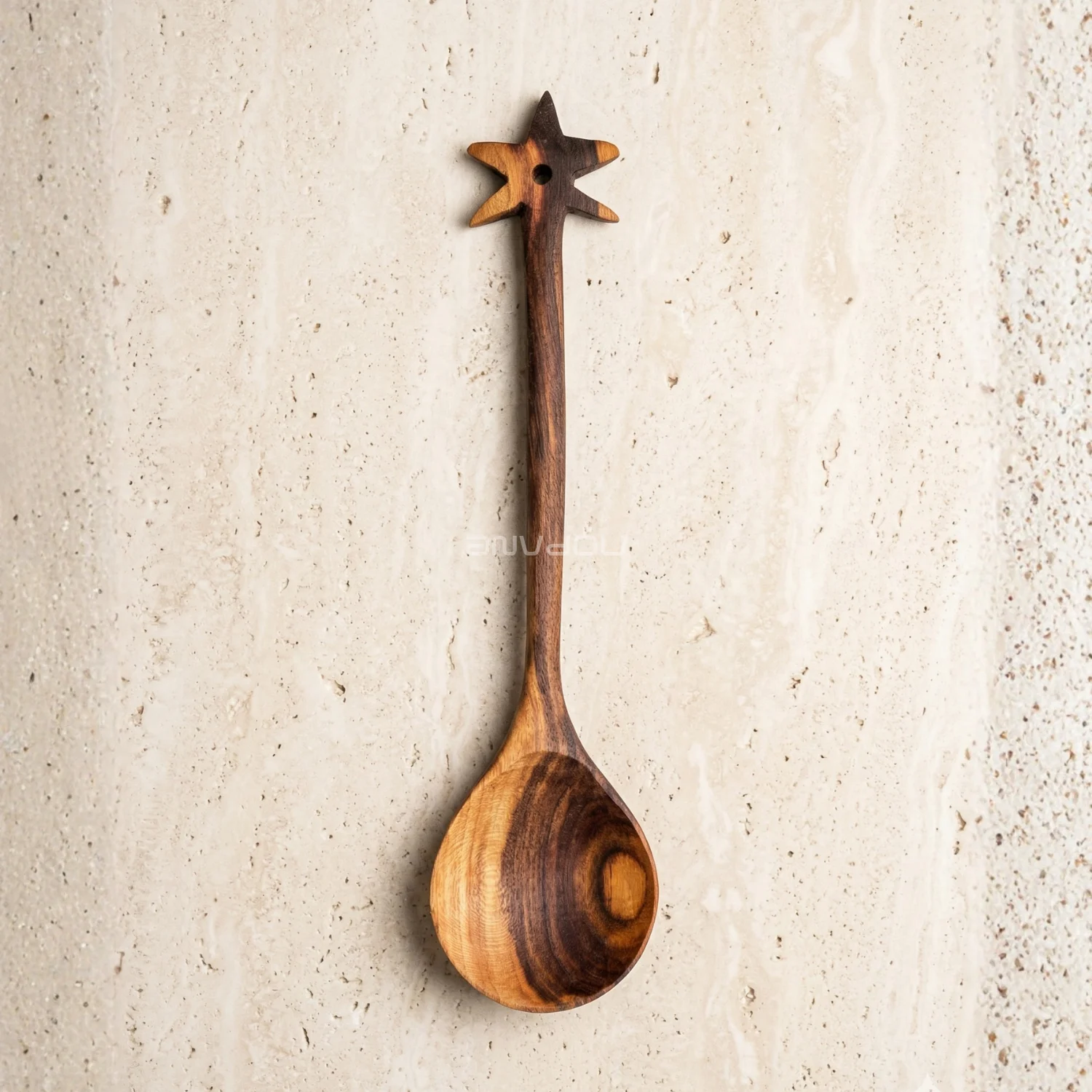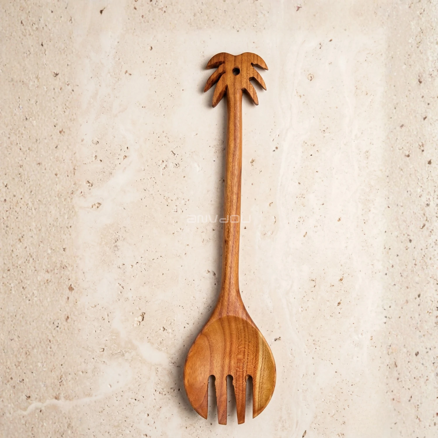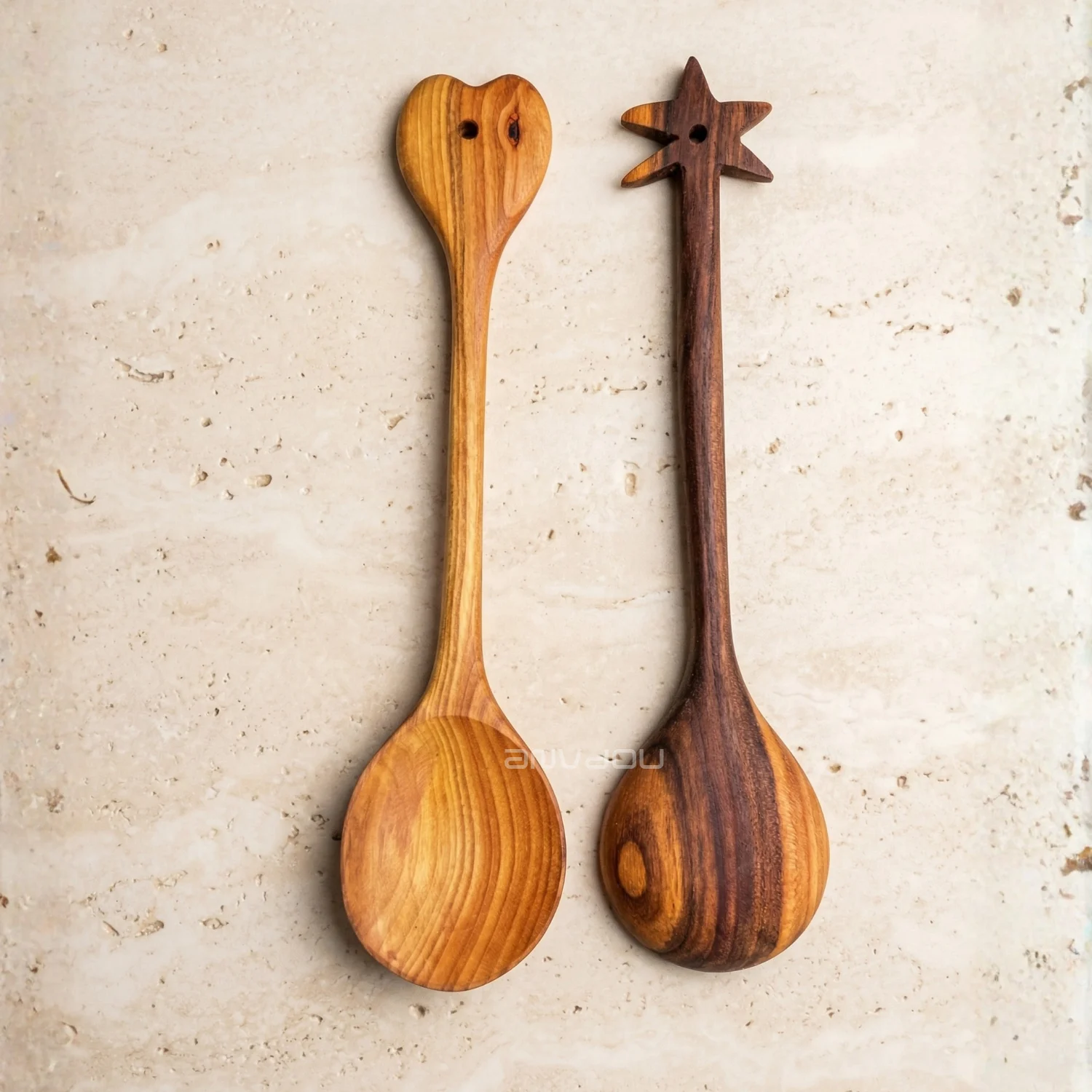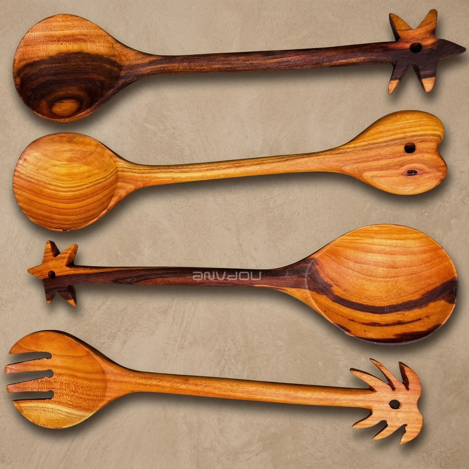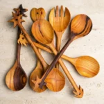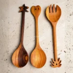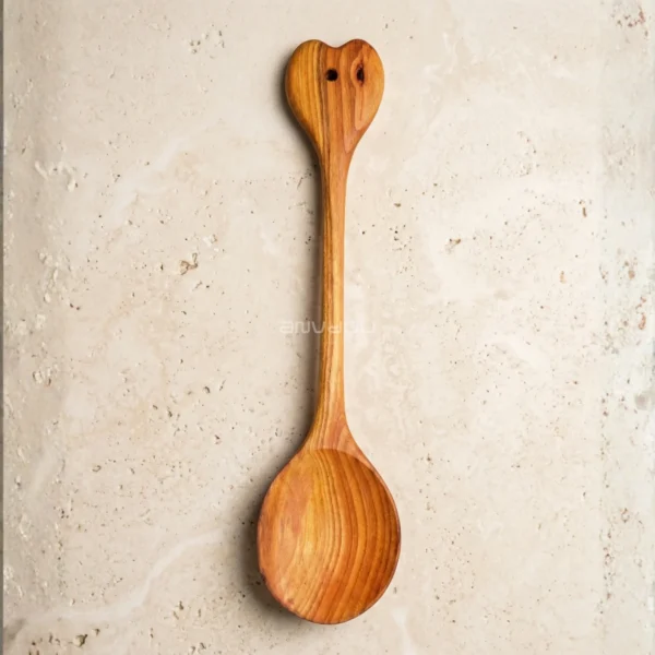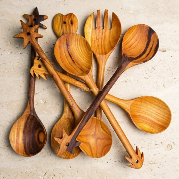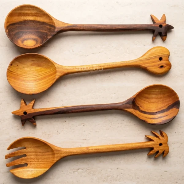 Made from premium almond wood, each piece showcases rich, warm tones and distinctive grain patterns, making every set truly one of a kind. The artistic handle design adds a decorative touch, blending traditional craftsmanship with modern aesthetics.