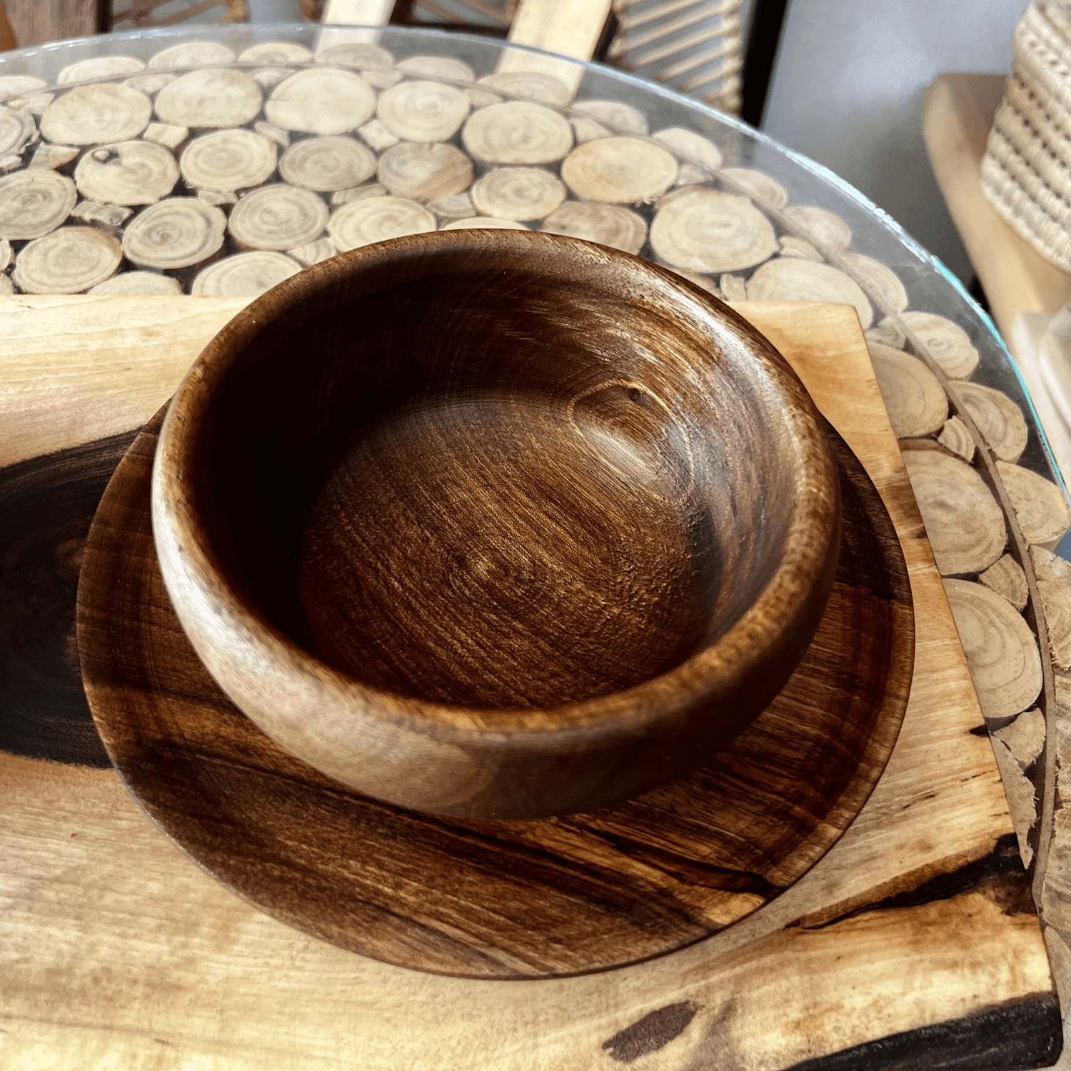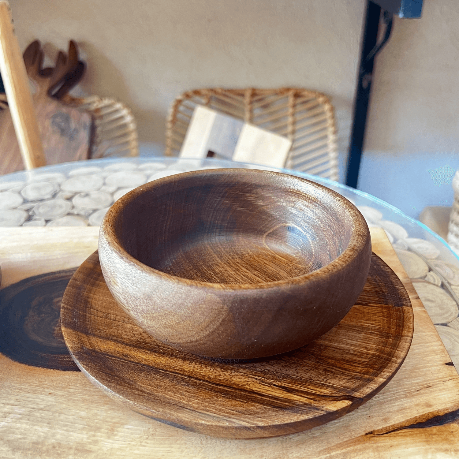 Each piece is carved by skilled artisans using ethically sourced walnut wood, showcasing rich natural tones and unique grain patterns. Whether you’re hosting guests or enjoying a cozy meal, this rustic wooden set adds a warm, earthy touch to any table.